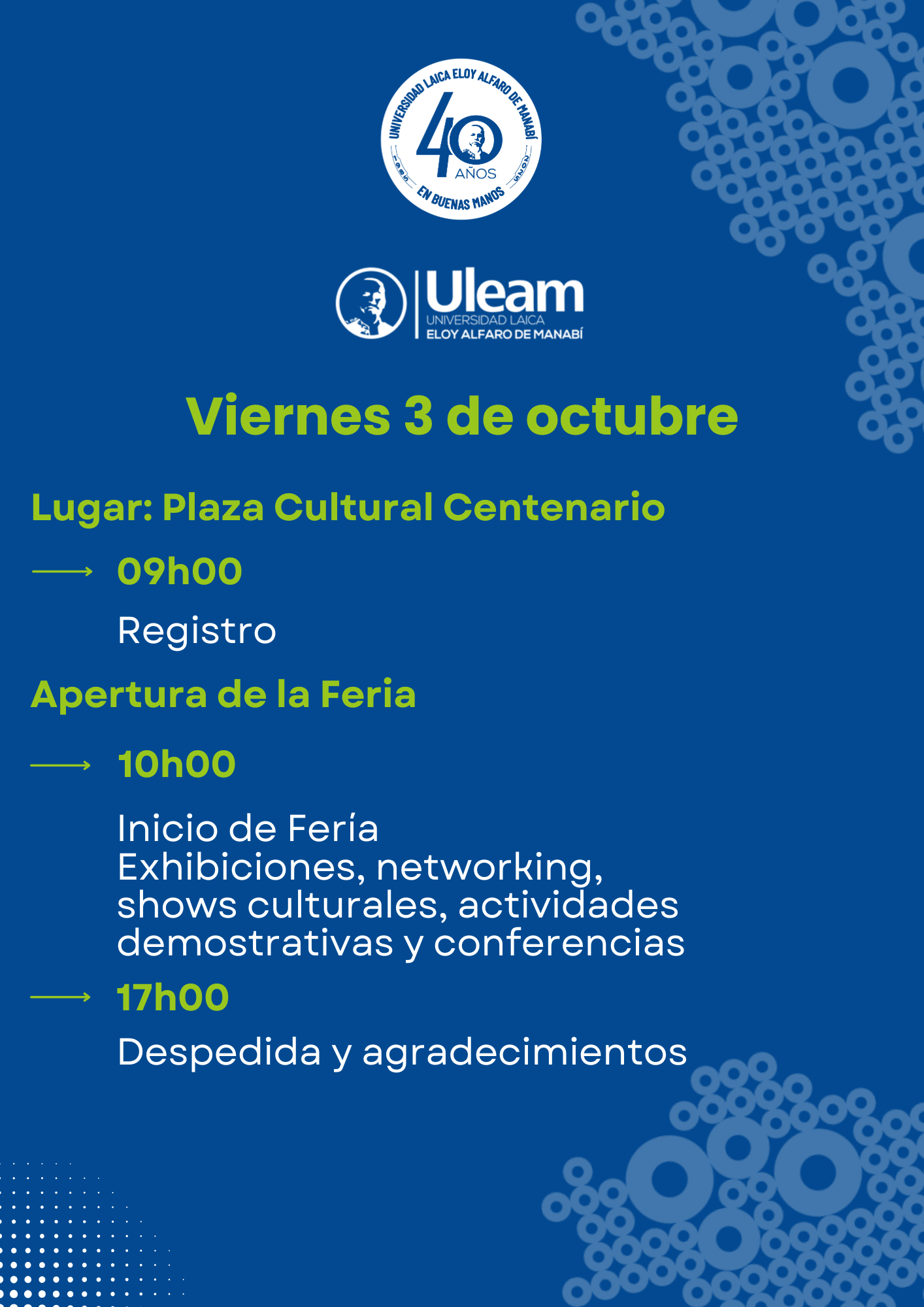 Inicio de Feria. Exhibiciones, networking, shows culturales, actividades demostrativas y conferencias |