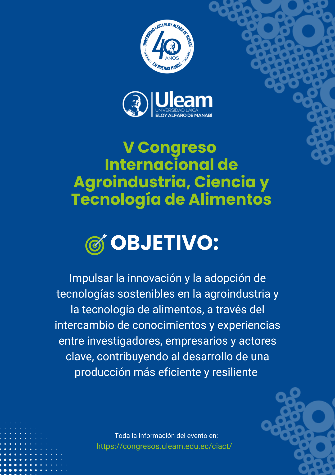 Impulsar la innovación y la adopción de tecnologías sostenibles en la agroindustria y la tecnología de alimentos, a través del intercambio de conocimientos y experiencias entre investigadores, empresarios y actores clave, contribuyendo al desarrollo de una producción más eficiente y resiliente.
