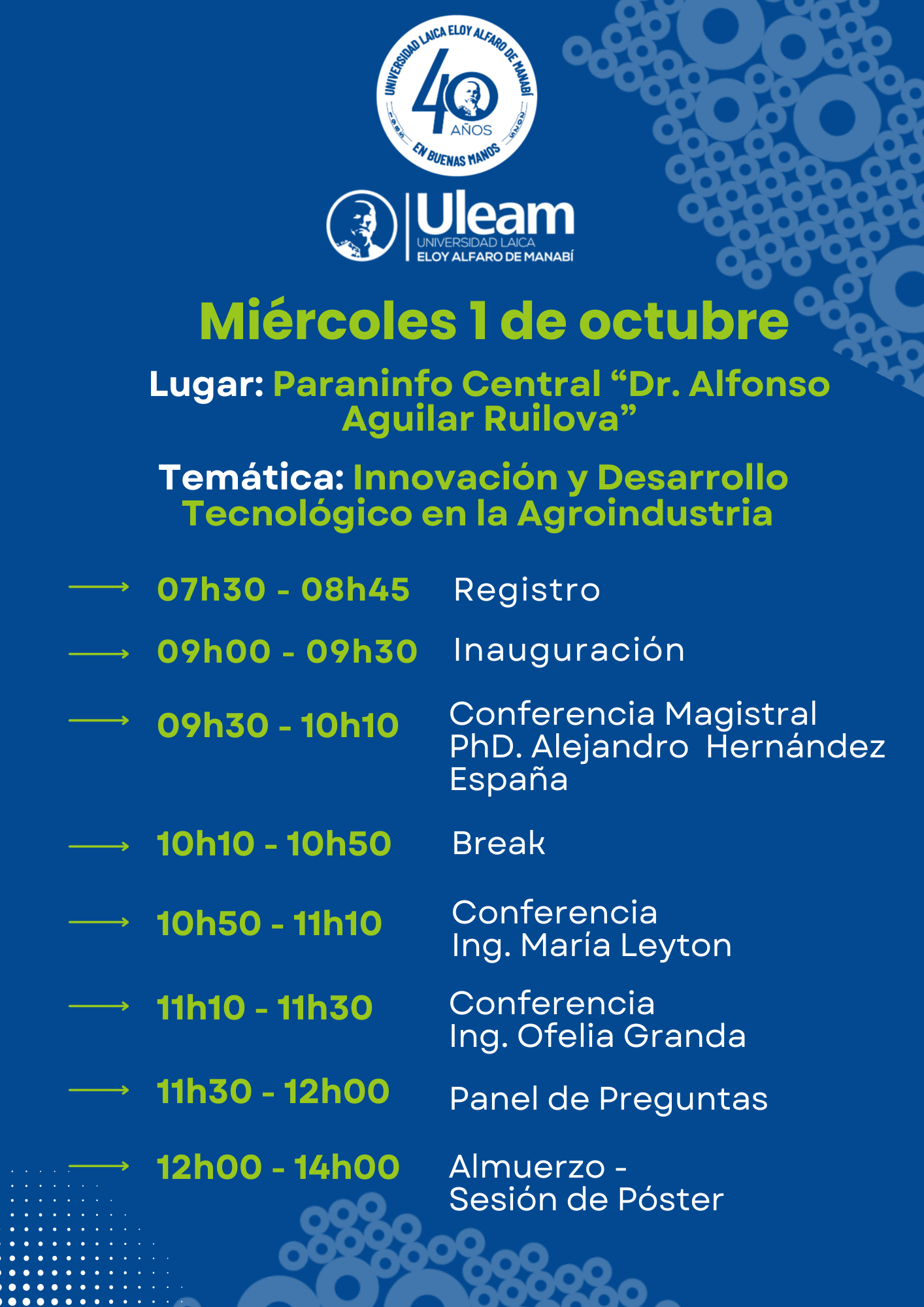 | 09:30 – 10:20 | Conferencia Magistral Mg. Alejandro |
