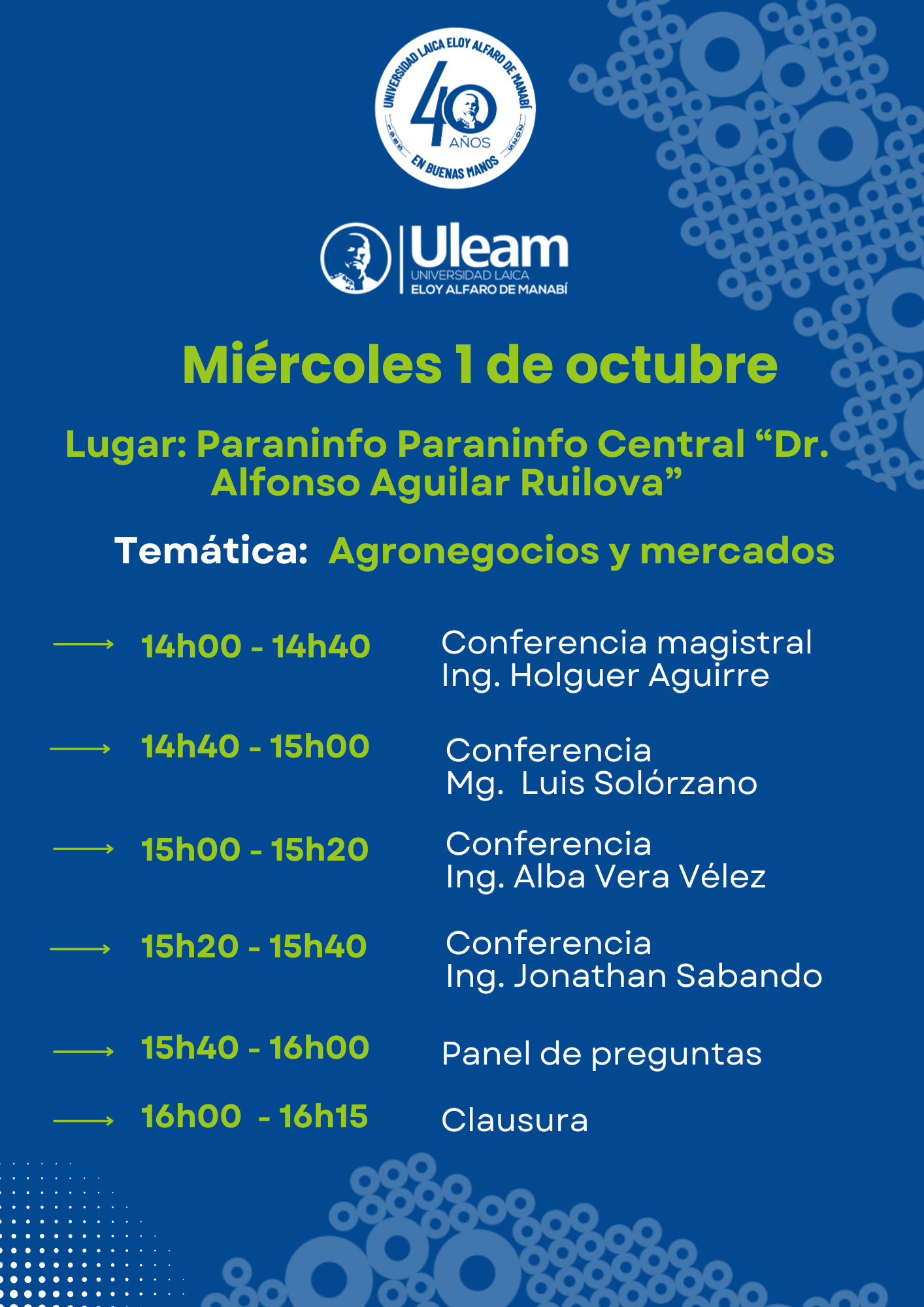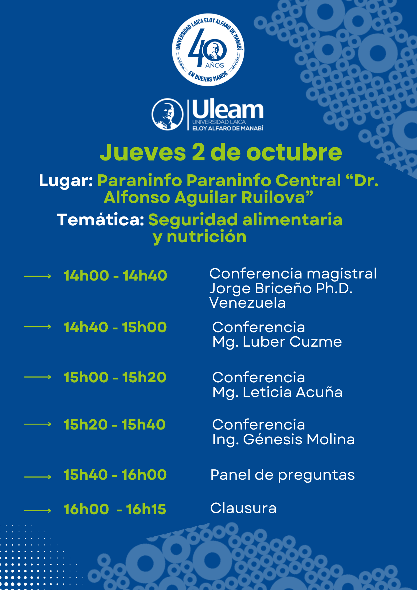 | 15:20 – 15:40 | Conferencia Ing. Génesis Molina |